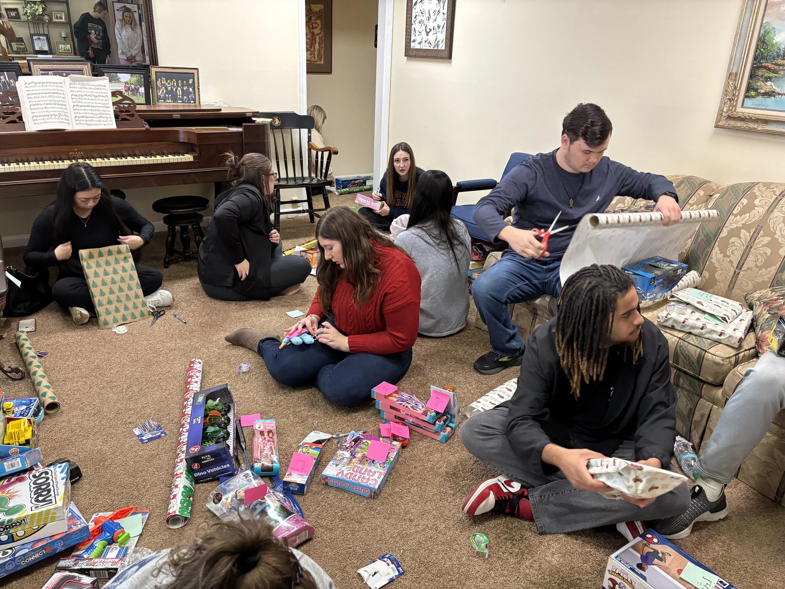 Scholars collect and wrap toys for Capstone Health Center clients for Christmas.